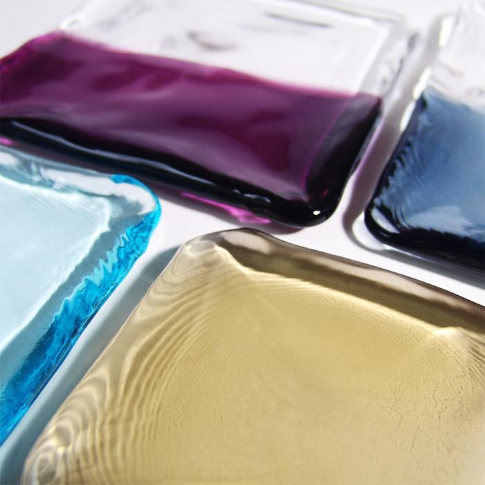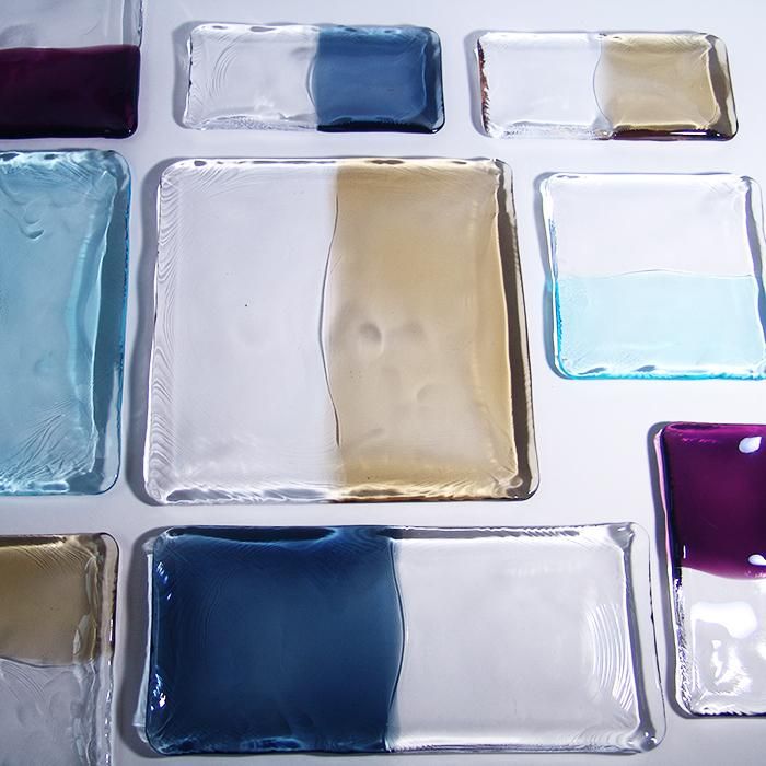 クリアガラスとカラーガラスを熱々のうちに合体させてのばして一枚のプレートにする。